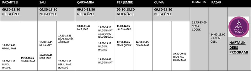 PRANAYOGA HAFTALIK DERS PROGRAMI